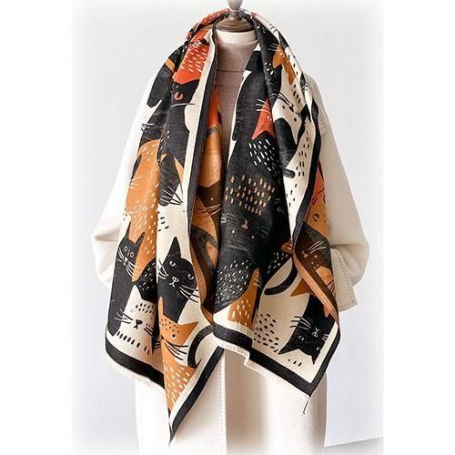 猫うにゃにゃ〜大判ストール【ベージュ・ブラウン・黒MIX】